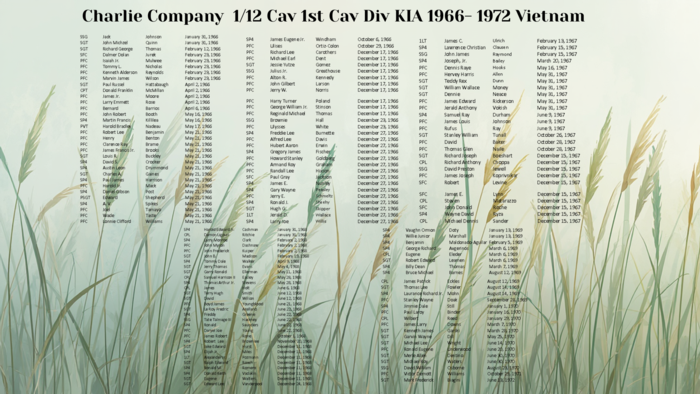 Welcome to the Charlie Company 1st Bn. 12th Cav Reg 1st Cav Div Vietnam Class of 65-72..The site is easy to navigate and will be a great tool for us to keep in touch and it is secure... All info and pictures will not be seen by outside eyes... Only those who are logged in can see the info on profiles... So you won't have to worry about getting Emails from spammers..